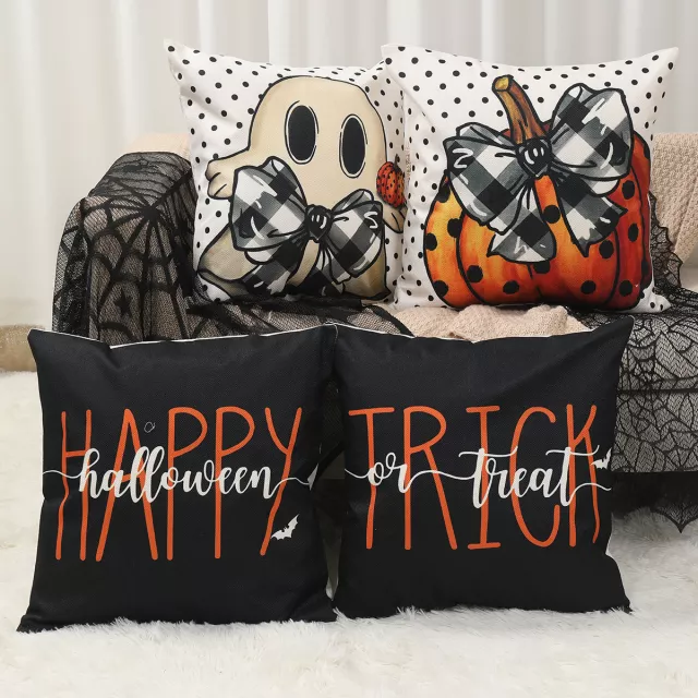4pcs Halloween Pillow Covers with Ghost, Skeleton & Trick or Treat Designs