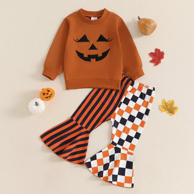 Get your baby girl ready for spooky season in style with this charming 2-piece Halloween outfit. The set includes a cozy long sleeve sweatshirt with playful pumpkin embroidery and a pair of striped flare pants that bring festive fun to every occasion. Perfect for fall photos, pumpkin patch visits, trick-or-treating, or simply enjoying crisp autumn days, this outfit combines comfort with seasonal charm.